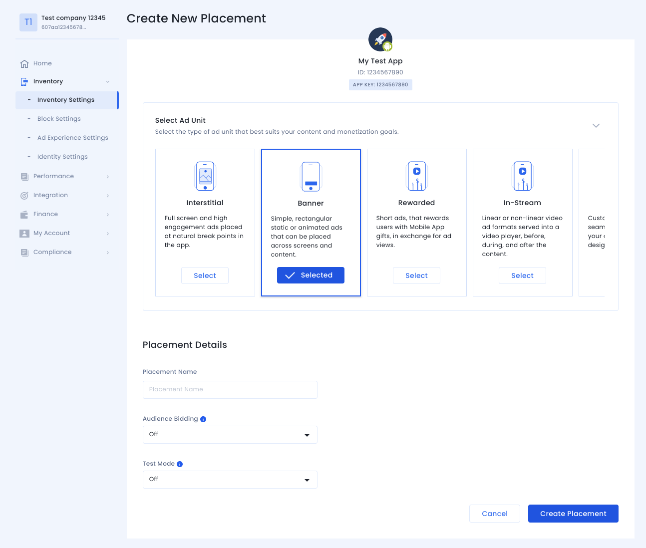 Pilih jenis unit iklan. Kemudian, masukkan Nama Penempatan, pilih Nonaktif untuk Bidding Audiens, dan isi bagian formulir lainnya. Klik Buat Penempatan setelah selesai.