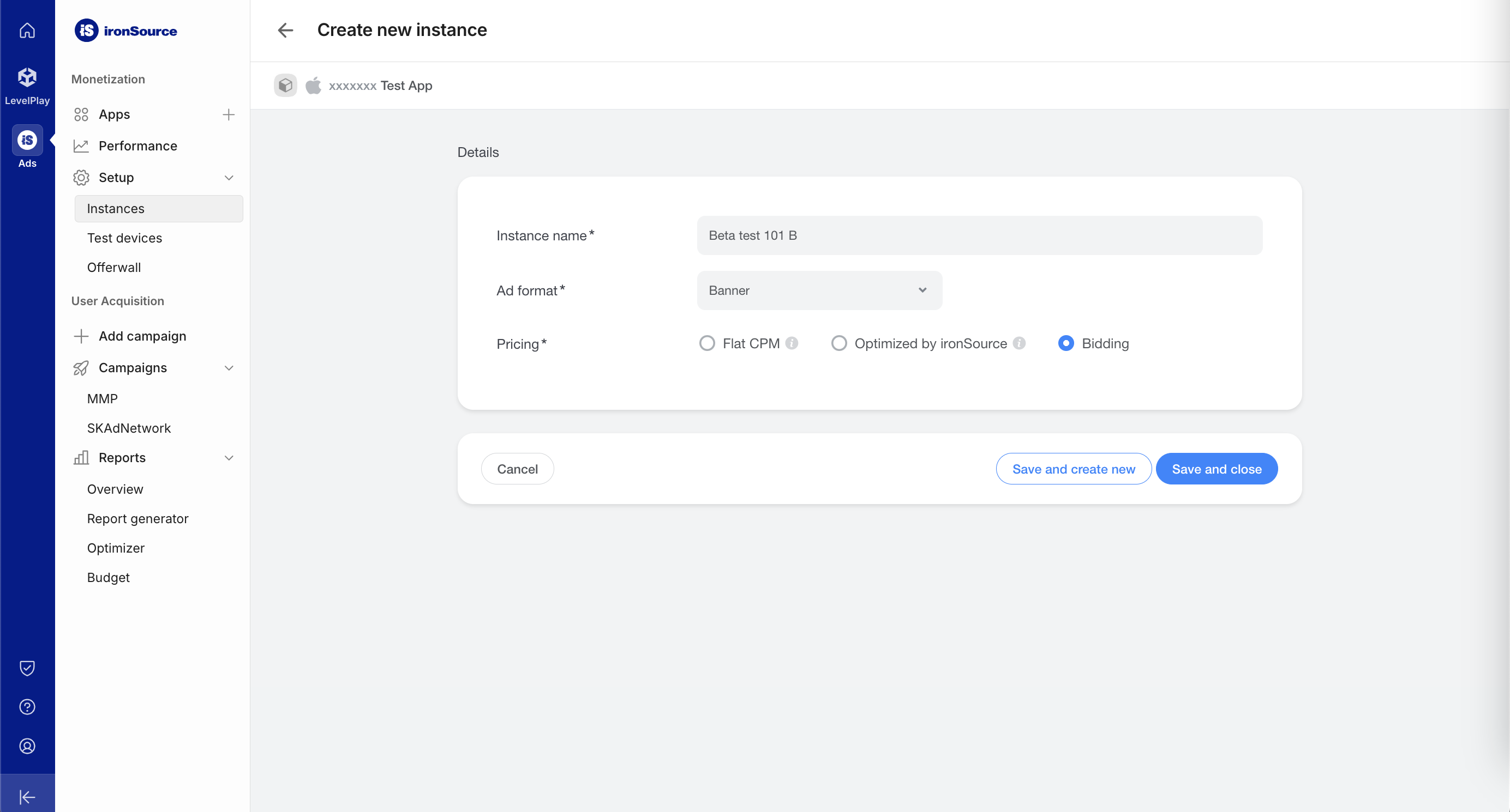 Navegue até Anúncios > Configuração > Instâncias. Selecione o app e clique em Criar instância.