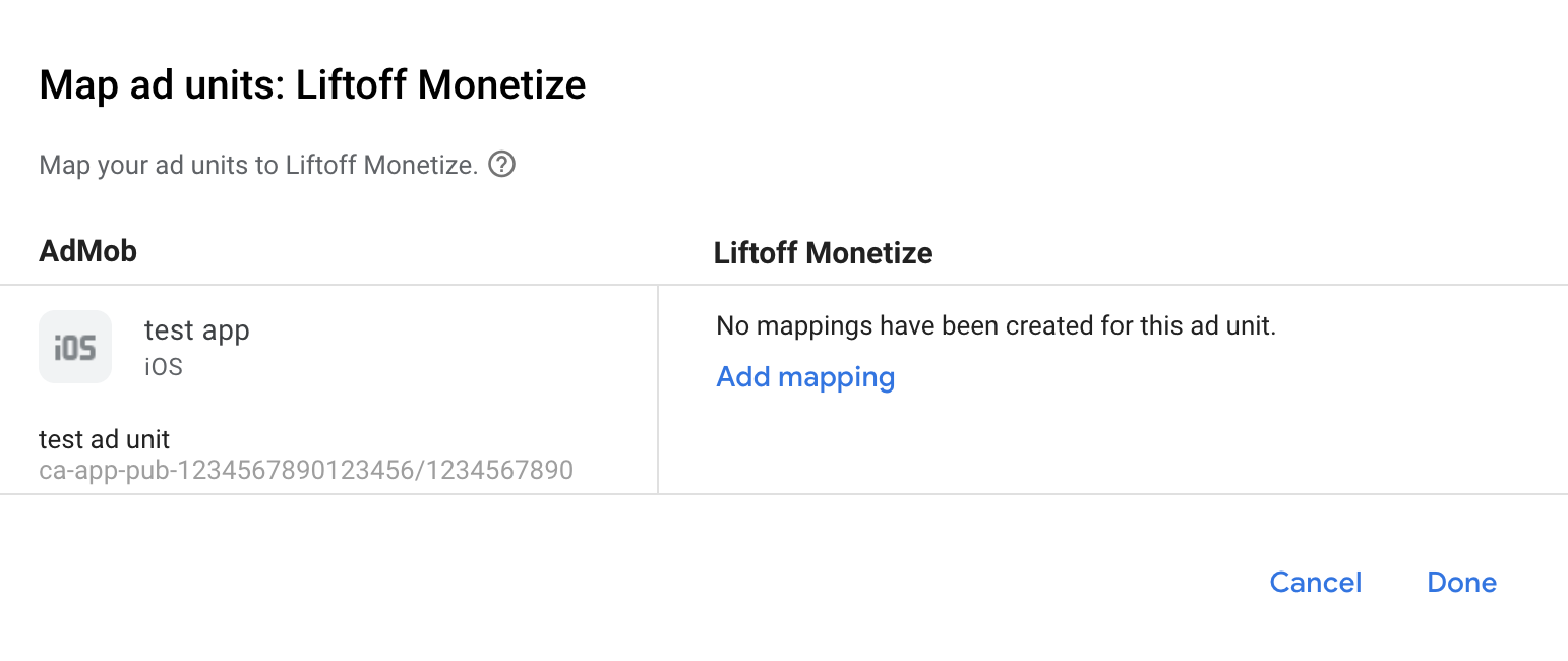 Liftoff Monetize에 대한 매핑이 이미 있는 경우 이를 선택할 수 있습니다. 그렇지 않으면 매핑 추가를 클릭합니다.