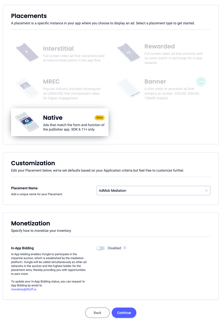 Вам необходимо добавить Liftoff Monetize в конфигурацию медиации для вашего рекламного блока.