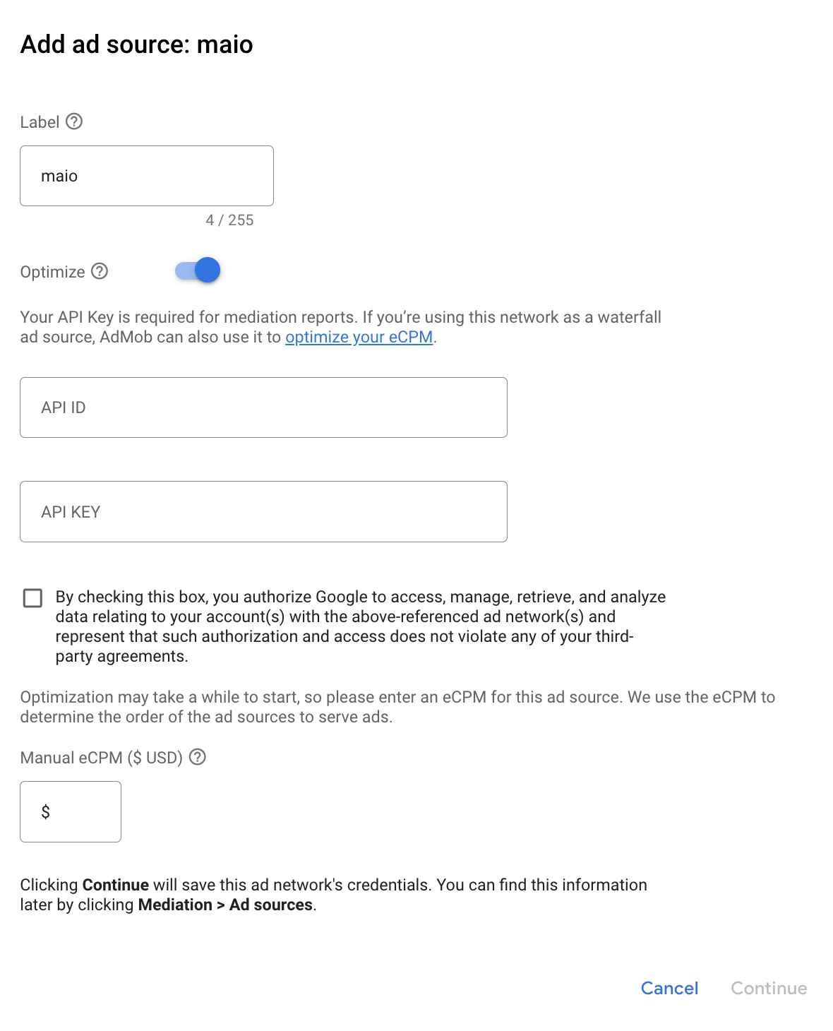 Seleziona maio e attiva l'opzione Ottimizza. Inserisci l'ID API e la CHIAVE API ottenuti nella sezione precedente per configurare l'ottimizzazione dell'origine annuncio per maio. Poi inserisci un valore eCPM per maio e fai clic su Continua.