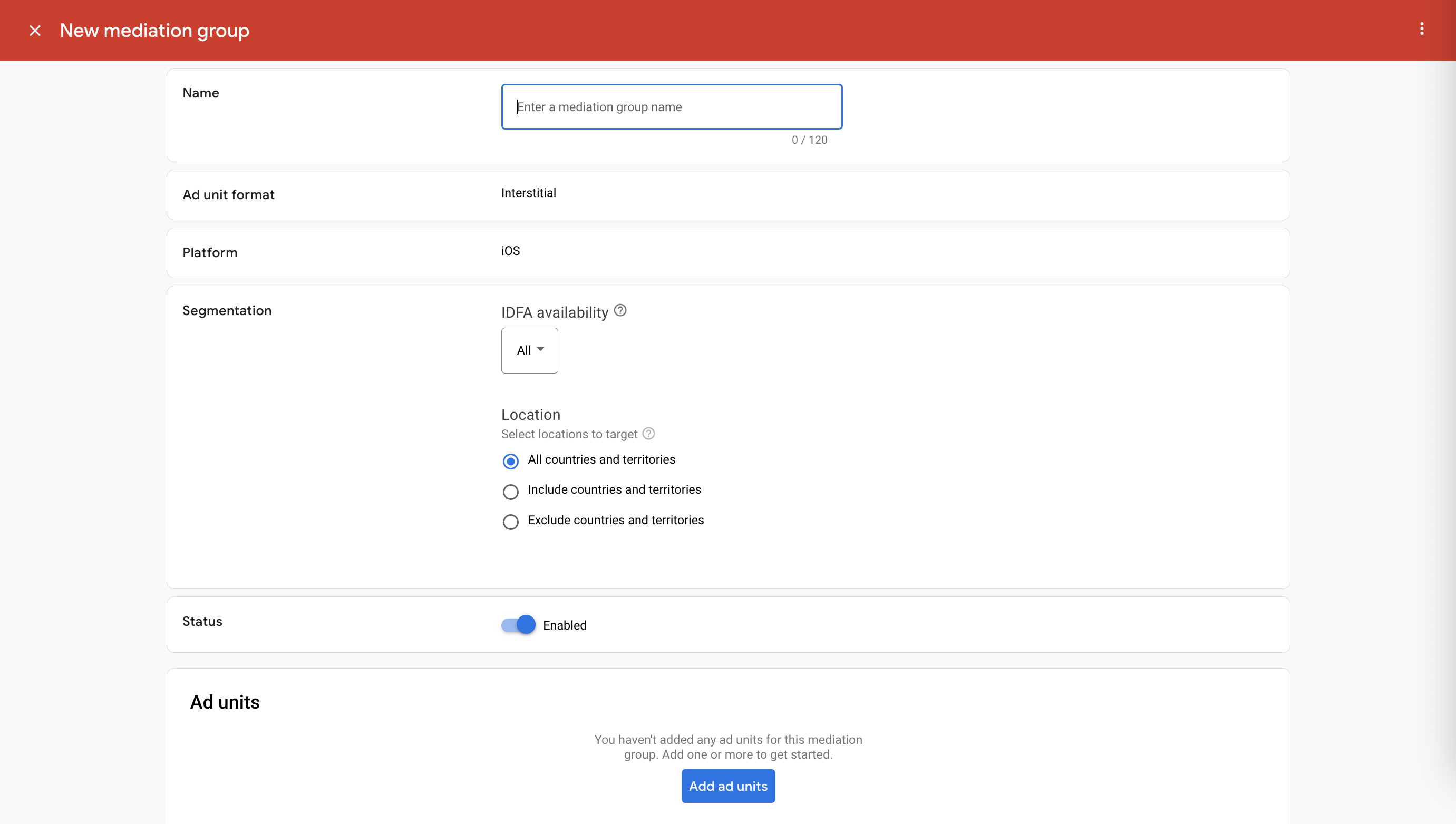 Beri nama grup mediasi Anda, lalu pilih lokasi yang akan ditargetkan. Selanjutnya, tetapkan status grup mediasi ke Diaktifkan, lalu klik Tambahkan Unit Iklan.