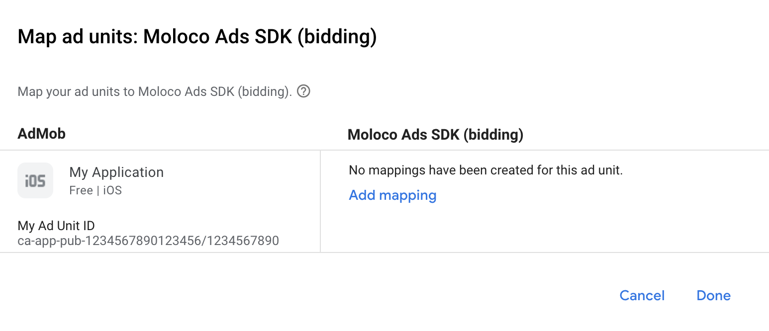 Jika sudah memiliki pemetaan untuk Moloco Ads SDK, Anda dapat memilihnya. Jika tidak, klik Tambahkan pemetaan.