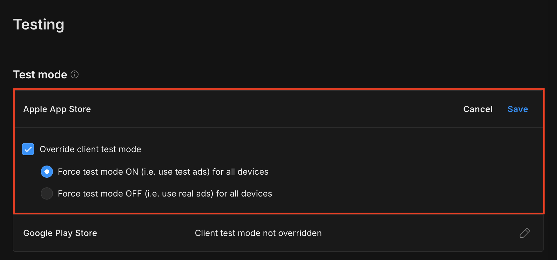Sie können den Testmodus für Ihre App erzwingen, indem Sie neben Apple App Store auf die Schaltfläche „Bearbeiten“ klicken, Client-Testmodus überschreiben aktivieren und Testmodus für alle Geräte erzwingen (d.h. Testanzeigen verwenden) auswählen.