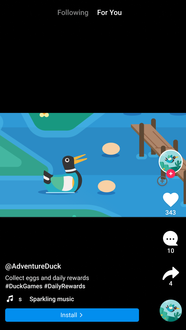 原生廣告格式支援各種大小的廣告,像是社群和娛樂應用程式中很受歡迎的全螢幕廣告,也可用這個格式建立。全螢幕原生廣告可以提高收益和留存率,無論在社群應用程式現有的全螢幕內容曝光,或是在「限時動態」等動態牆放送廣告,都可獲得出色成效。以下是全螢幕原生廣告範例: