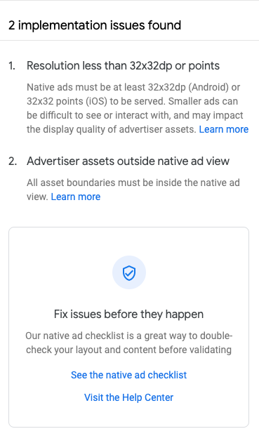 [[["Mudah dipahami","easyToUnderstand","thumb-up"],["Memecahkan masalah saya","solvedMyProblem","thumb-up"],["Lainnya","otherUp","thumb-up"]],[["Informasi yang saya butuhkan tidak ada","missingTheInformationINeed","thumb-down"],["Terlalu rumit/langkahnya terlalu banyak","tooComplicatedTooManySteps","thumb-down"],["Sudah usang","outOfDate","thumb-down"],["Masalah terjemahan","translationIssue","thumb-down"],["Masalah kode / contoh","samplesCodeIssue","thumb-down"],["Lainnya","otherDown","thumb-down"]],["Terakhir diperbarui pada 2026-02-19 UTC."],[],["Native Validator, available in Google Mobile Ads SDK 7.68.0 or higher, identifies AdMob policy violations in native ad placements within test ads. It displays an overlay popup next to the ad, alerting users to potential issues and providing a fullscreen list of violations when \"See Issues\" is clicked. Enabled by default for test ads on test devices, it can be disabled by setting `GADNativeAdValidatorEnabled` to `false` in the `Info.plist`, which prevents it from showing policy violations.\n"]]