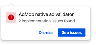 [[["Anlaması kolay","easyToUnderstand","thumb-up"],["Sorunumu çözdü","solvedMyProblem","thumb-up"],["Diğer","otherUp","thumb-up"]],[["İhtiyacım olan bilgiler yok","missingTheInformationINeed","thumb-down"],["Çok karmaşık / çok fazla adım var","tooComplicatedTooManySteps","thumb-down"],["Güncel değil","outOfDate","thumb-down"],["Çeviri sorunu","translationIssue","thumb-down"],["Örnek veya kod sorunu","samplesCodeIssue","thumb-down"],["Diğer","otherDown","thumb-down"]],["Son güncelleme tarihi: 2026-02-19 UTC."],[],["Native Validator, available in Google Mobile Ads SDK 7.68.0 or higher, identifies AdMob policy violations in native ad placements within test ads. It displays an overlay popup next to the ad, alerting users to potential issues and providing a fullscreen list of violations when \"See Issues\" is clicked. Enabled by default for test ads on test devices, it can be disabled by setting `GADNativeAdValidatorEnabled` to `false` in the `Info.plist`, which prevents it from showing policy violations.\n"]]