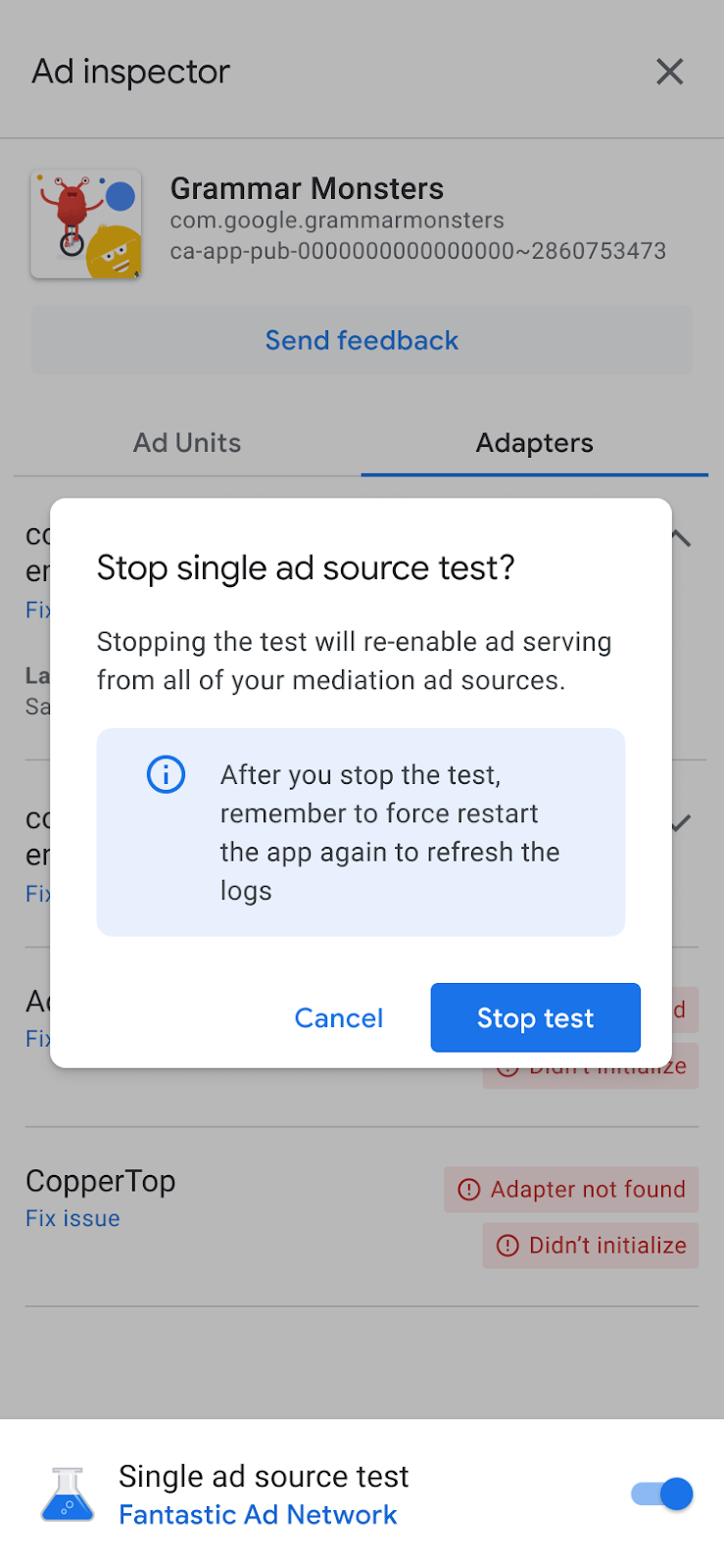 टेस्ट किए गए विज्ञापन सोर्स के लिए, कैश मेमोरी में सेव किए गए विज्ञापनों को रद्द करने के लिए, हमारा सुझाव है कि टेस्ट रोकने के बाद, ऐप्लिकेशन को ज़बरदस्ती रीस्टार्ट करें.