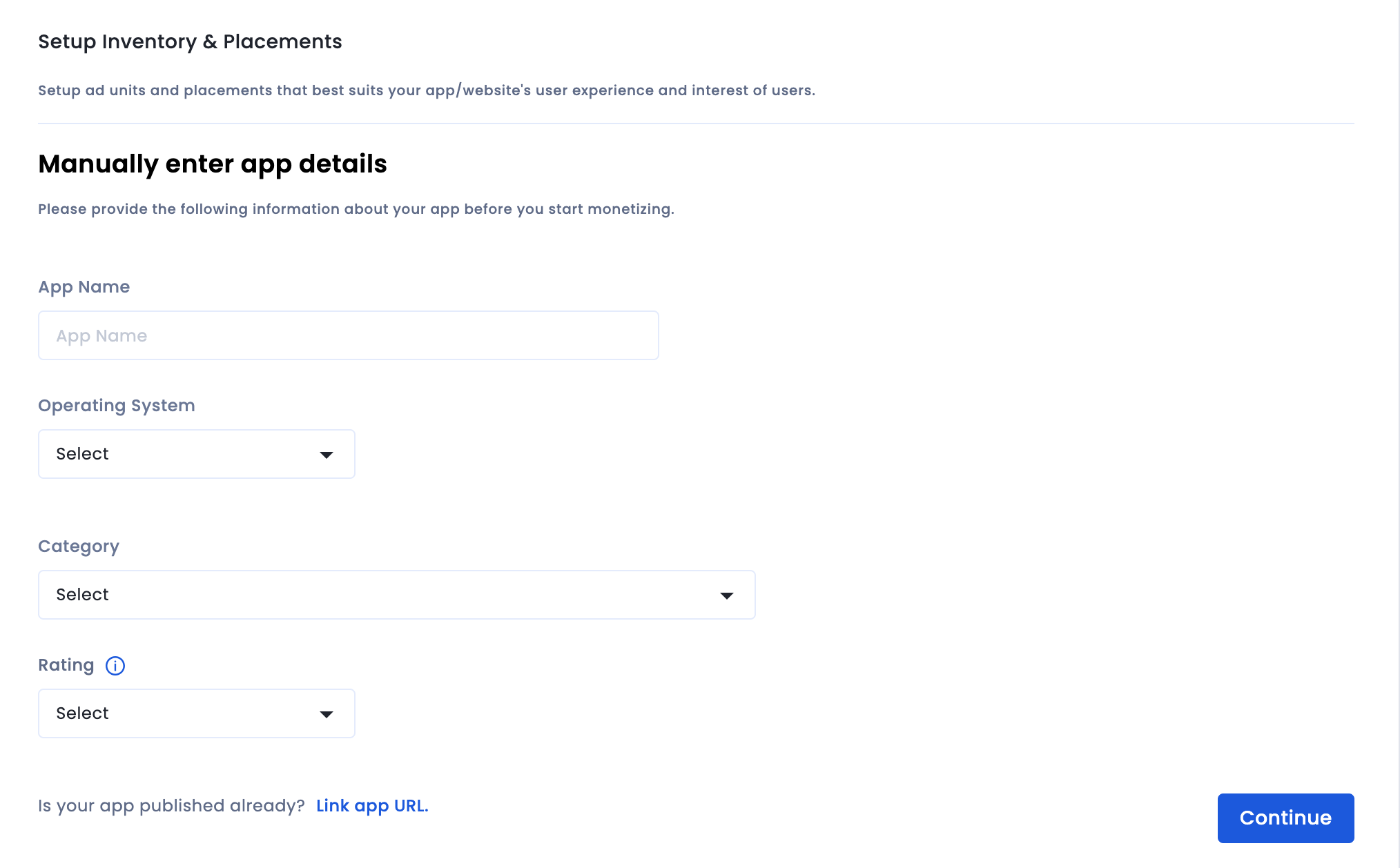 アプリが公開されていない場合は、[手動でリンク] をクリックして、必要な詳細情報を入力します。[続行] をクリックします。