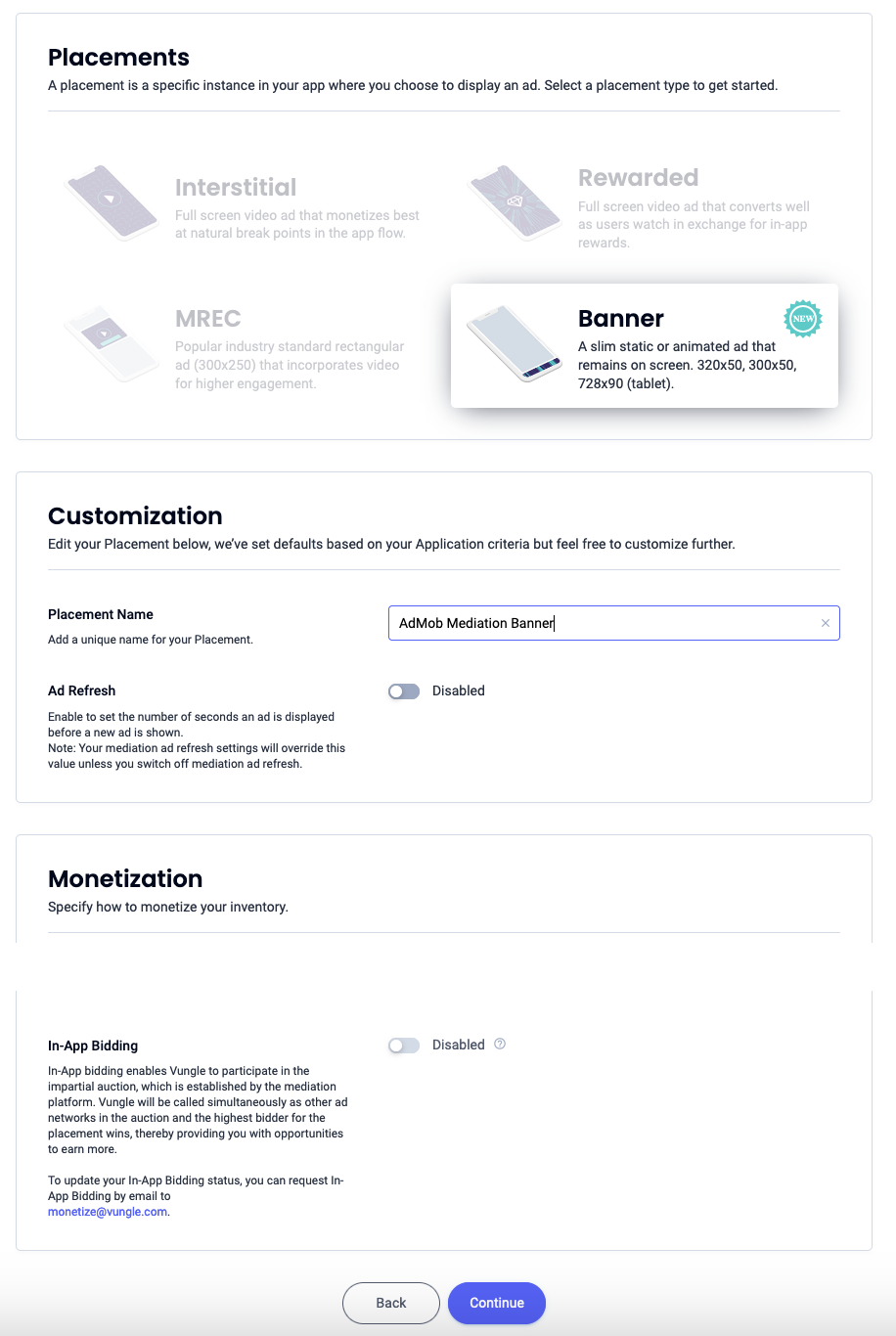 배너를 선택하고 Placement Name(게재위치 이름)을 입력한 후 양식의 나머지 부분을 작성합니다. [입찰만 해당] 수익 창출에서 인앱 입찰 스위치를 사용 설정됨으로 전환합니다. 페이지 하단의 계속 버튼을 클릭하여 게재위치를 만듭니다.