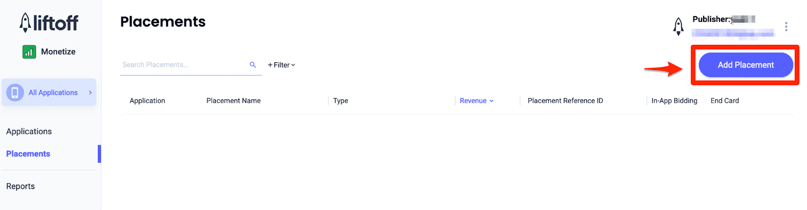 Wenn Sie ein neues Placement für die AdMob-Vermittlung erstellen möchten, rufen Sie das Liftoff Monetize Placements-Dashboard auf, klicken Sie auf die Schaltfläche Placement hinzufügen und wählen Sie Ihre App aus der Drop-down-Liste aus.