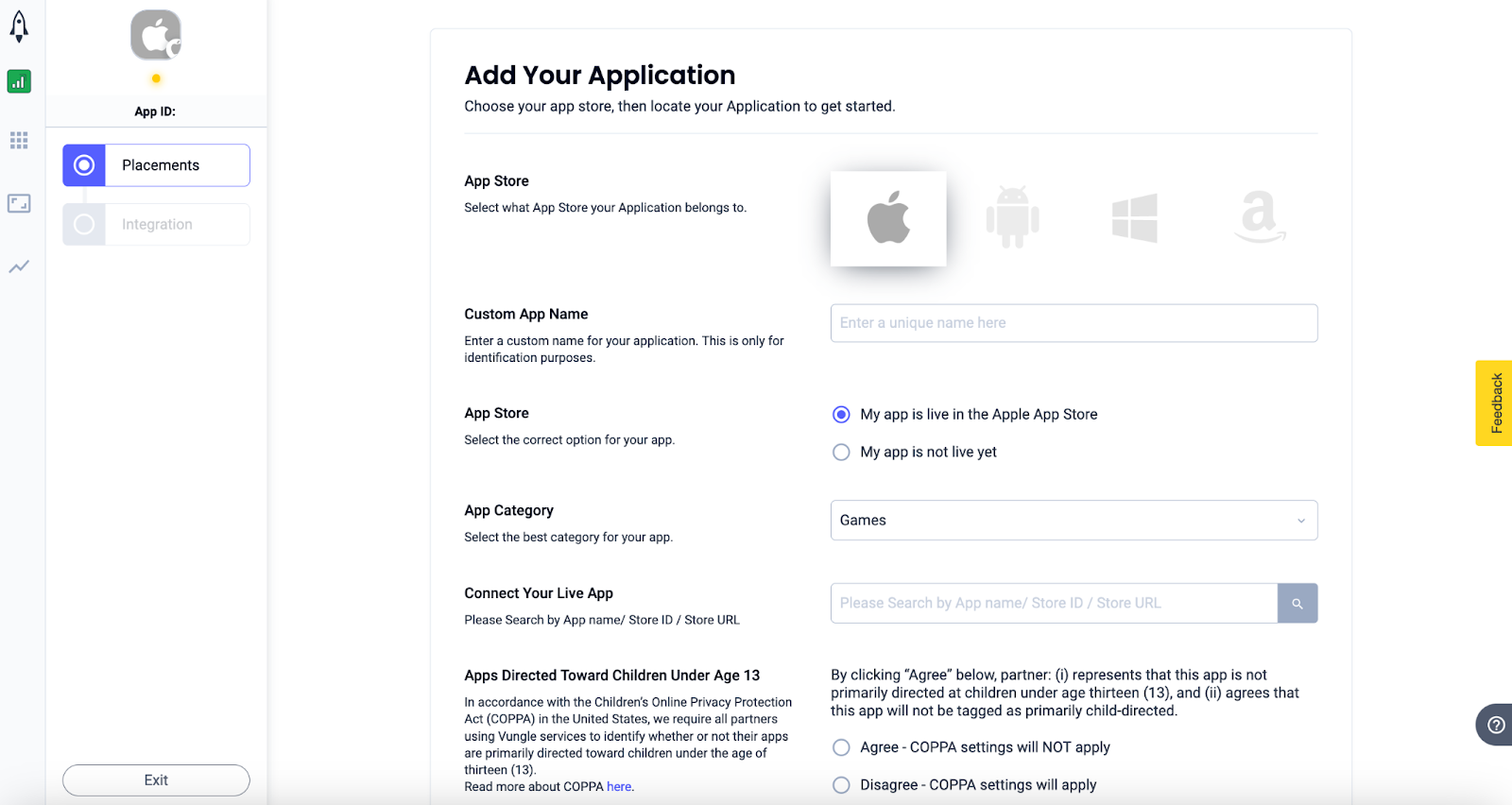Wählen Sie Nativ aus, geben Sie einen Placement-Namen ein und füllen Sie den Rest des Formulars aus. [Nur Gebote] Stellen Sie unter Monetarisierung den Schalter für In-App-Gebote auf Aktiviert. Klicken Sie unten auf der Seite auf die Schaltfläche Weiter, um die Platzierung zu erstellen.