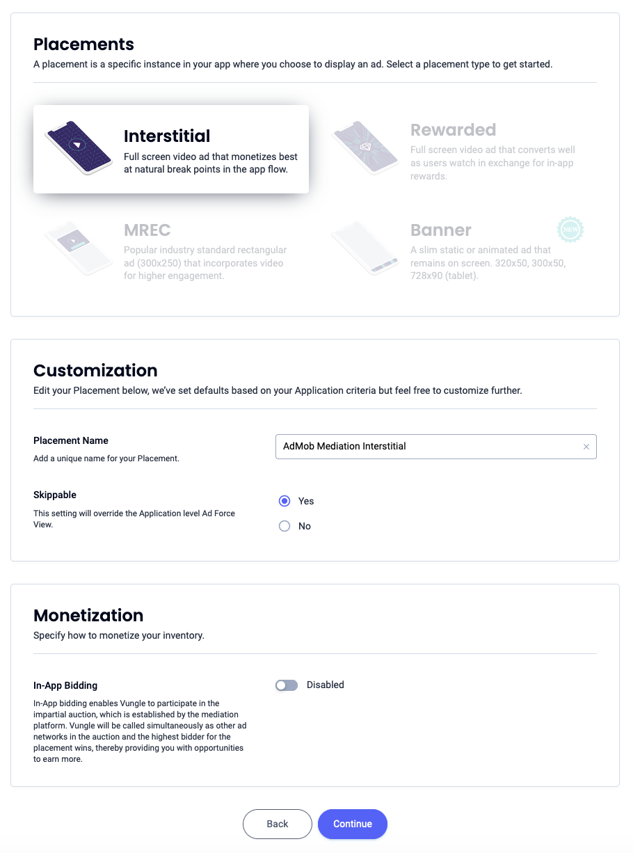 전면 광고를 선택하고 Placement Name(게재위치 이름)을 입력한 후 양식의 나머지 부분을 작성합니다. [입찰만 해당] 수익 창출에서 인앱 입찰 스위치를 사용 설정됨으로 전환합니다. 페이지 하단의 계속 버튼을 클릭하여 게재위치를 만듭니다.