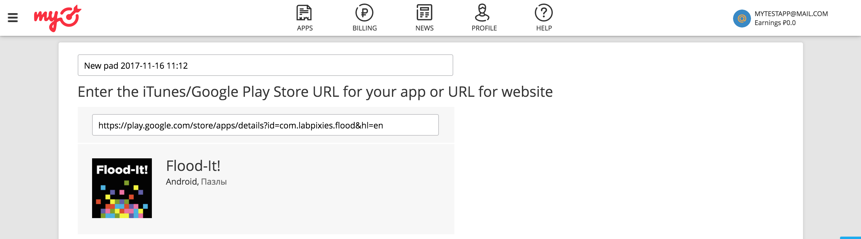 Accede a tu cuenta de myTarget. Haz clic en APPS en el encabezado para navegar a la página de Apps. Haz clic en AGREGAR APP para agregar tu app.