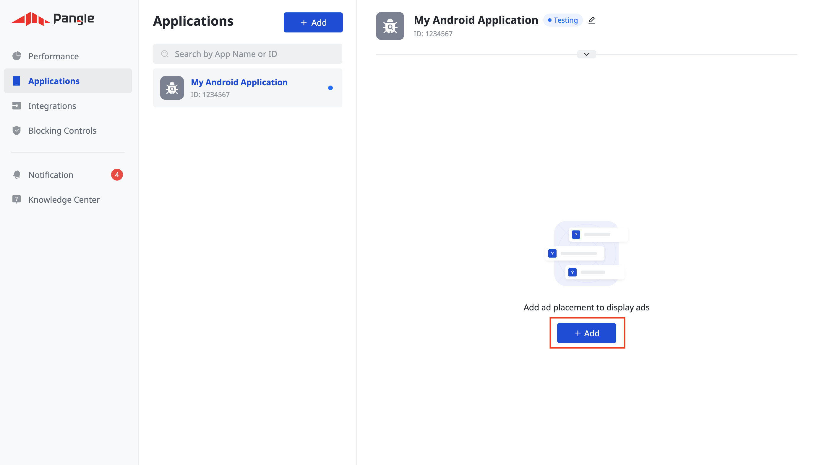Una vez creada tu aplicación, haz clic en el botón Add para crear tu posición de anuncios.