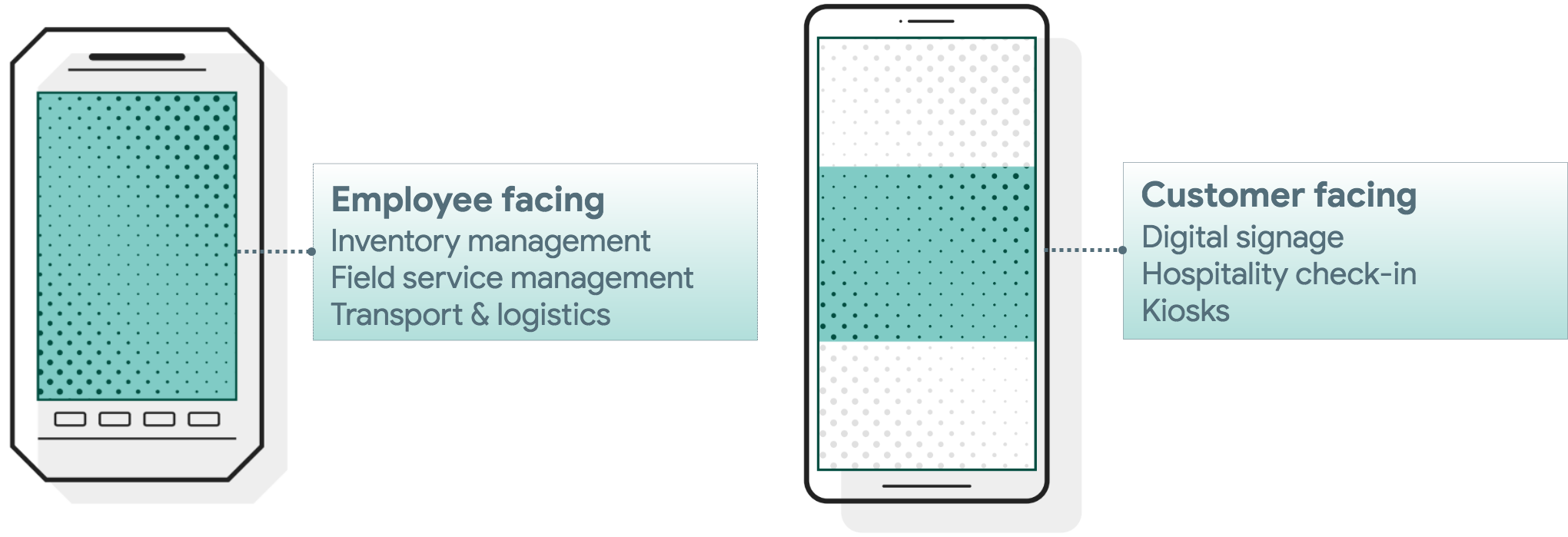 Dedykowane urządzenia (dawniej określane jako jednorazowe urządzenia należące do firmy) to podzbiór w pełni zarządzanych urządzeń, które służą do określonego celu. Android oferuje szeroki zestaw funkcji zarządzania, które umożliwiają organizacjom konfigurowanie urządzeń do różnych zastosowań – od fabryk i przemysłów po oznakowanie i kioski przeznaczone dla klientów.
