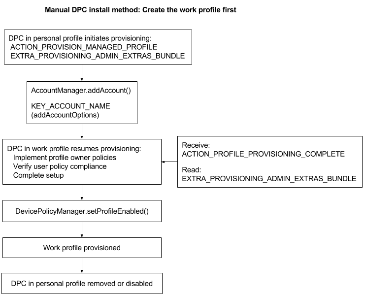 ACTION_PROFILE_PROVISIONING_COMPLETEand readsEXTRA_PROVISIONING_ADMIN_EXTRAS_BUNDLE. - The DPC in the work profile completes the provisioning process. Once the work profile is created, the DPC is also running inside the work profile. The DPC in the work profile completes the provisioning process by pushing policies for that managed Google Account, ensuring that the device isn't in a compromised state, and verifying that the policies are enforced (such as requiring a password).