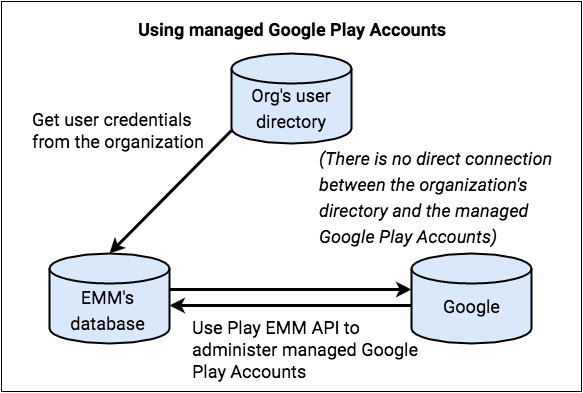 Gli account Google Play gestiti offrono alle aziende un mezzo trasparente per creare automaticamente account utente o dispositivo tramite il proprio fornitore di soluzioni di gestione della mobilità aziendale (EMM). Questi account forniscono l'accesso solo alla versione gestita di Google Play.