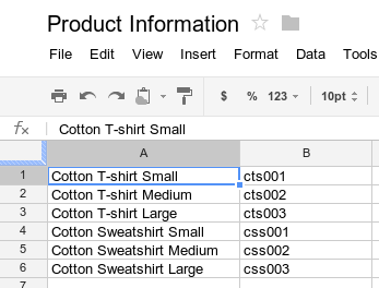 मान लीजिए कि आपके पास प्रॉडक्ट के नामों और प्रॉडक्ट नंबर की एक सूची है, जिसे आपने स्प्रेडशीट में सेव किया है. इसे यहां दी गई इमेज में दिखाया गया है.