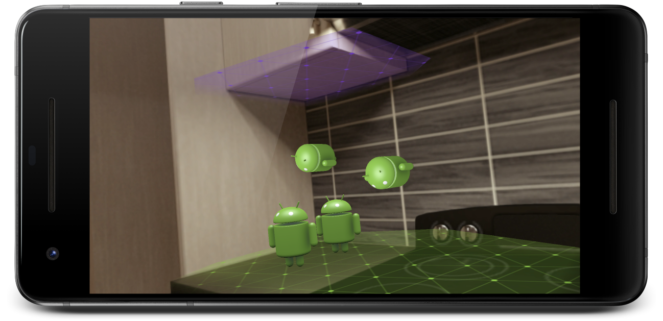 たとえば、アプリで、ユーザーが部屋の周りにバーチャルな家具を配置できるとします。ユーザーがアプリを開くと、ARCore が室内のテーブルトップと床を平面として追跡し始めます。ユーザーが仮想ランプをテーブルトップに置きます。