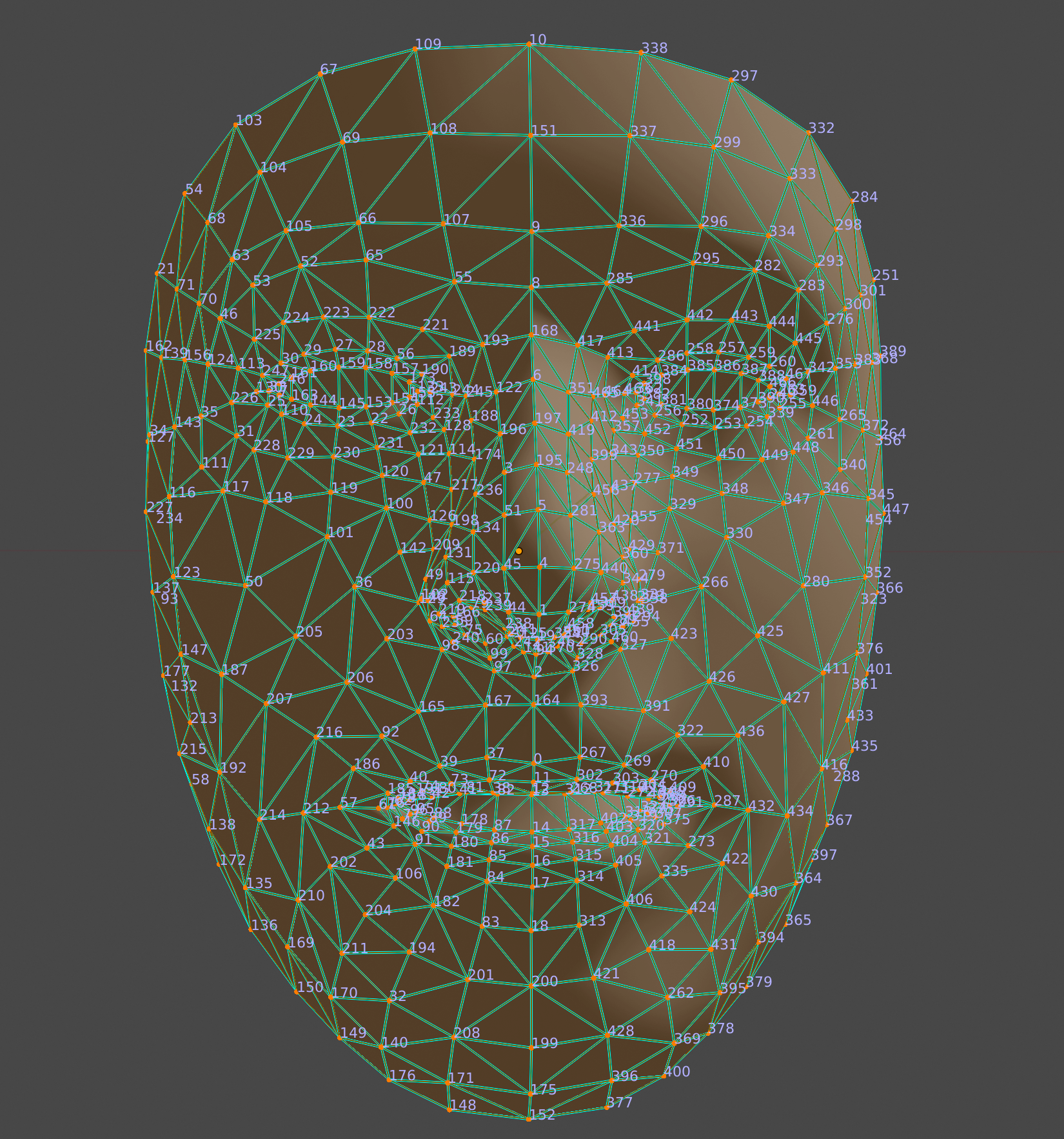 468 पॉइंट की घनी 3D फ़ेस मेश की मदद से, ऐसे टेक्सचर बनाए जा सकते हैं जो चेहरे के हिसाब से ढल जाते हैं और जिनमें ज़्यादा जानकारी होती है. उदाहरण के लिए, नाक के किसी हिस्से के पीछे वर्चुअल चश्मा लगाते समय. मेश, 3D की ज़्यादा जानकारी इकट्ठा करता है, ताकि इस वर्चुअल इमेज को आसानी से रेंडर किया जा सके.