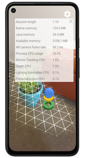 טכנולוגיית ARCore יכולה להציג חלונית שכבת-על עם נתונים סטטיסטיים של ביצועים של אפליקציות כמו השימוש במעבד (CPU) ובזיכרון, כדי לספק סקירה כללית בזמן אמת של משאבי המערכת.