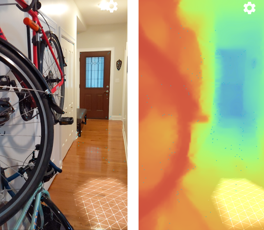 Dengan Depth API, Anda dapat mengambil gambar kedalaman yang cocok dengan setiap frame kamera. Gambar kedalaman yang diperoleh memiliki stempel waktu dan intrinsik bidang pandang yang sama dengan kamera. Data kedalaman yang valid hanya tersedia setelah pengguna mulai menggerakkan perangkat, karena kedalaman diperoleh dari gerakan. Permukaan dengan sedikit atau tanpa fitur, seperti dinding putih, akan dikaitkan dengan kedalaman yang tidak akurat.