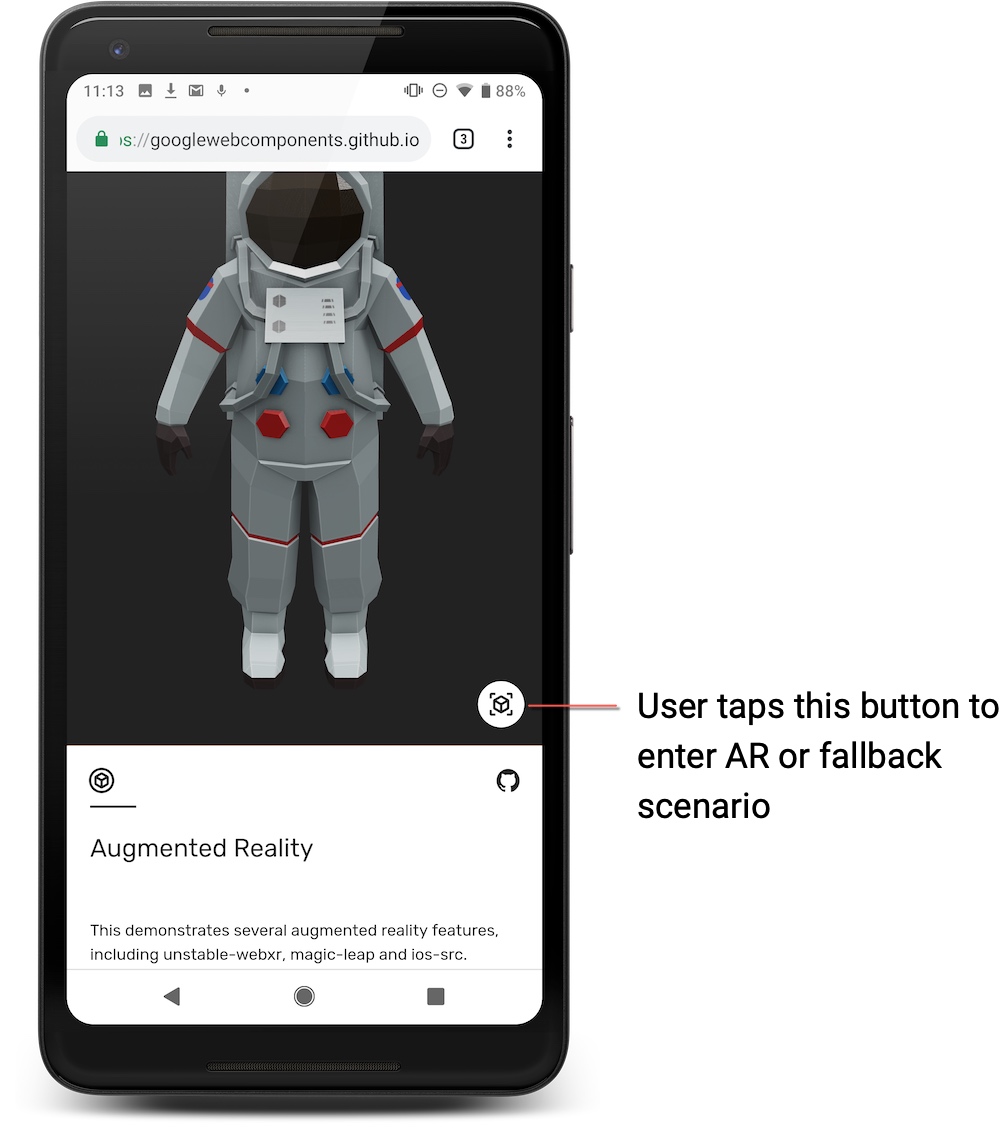 • Mungkin saja pengguna tidak memiliki Layanan Google Play untuk AR diinstal di perangkat mereka. Berikut adalah cara <model-viewer> menangani penggantian dan Anda dapat merasa bebas menggunakan potongan kode itu sebagai titik awal.