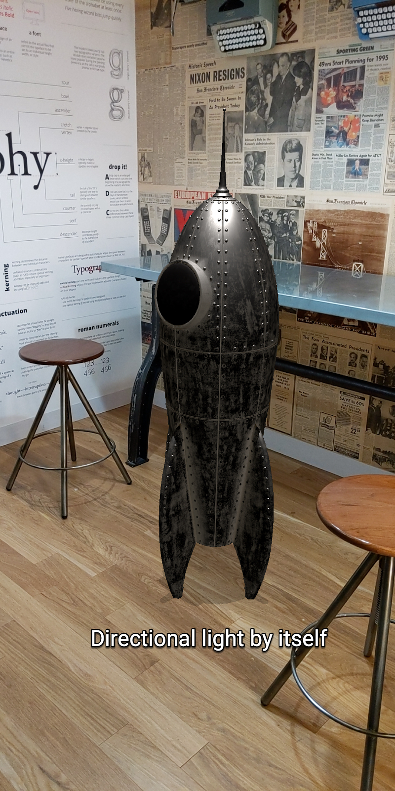 একই রকেট মডেলের এই দুটি ছবি বিবেচনা করুন। বাম দিকের রকেটটি প্রধান দিকনির্দেশক আলো API দ্বারা সনাক্ত করা আলোক অনুমান তথ্য ব্যবহার করে রেন্ডার করা হয়। ডানদিকের রকেটটি প্রধান দিক আলো এবং পরিবেষ্টিত গোলাকার হারমোনিক্স API উভয় দ্বারা সনাক্ত করা তথ্য ব্যবহার করে রেন্ডার করা হয়। দ্বিতীয় রকেটের স্পষ্টতই আরও ভিজ্যুয়াল সংজ্ঞা রয়েছে এবং দৃশ্যটিতে আরও নির্বিঘ্নে মিশে যায়।