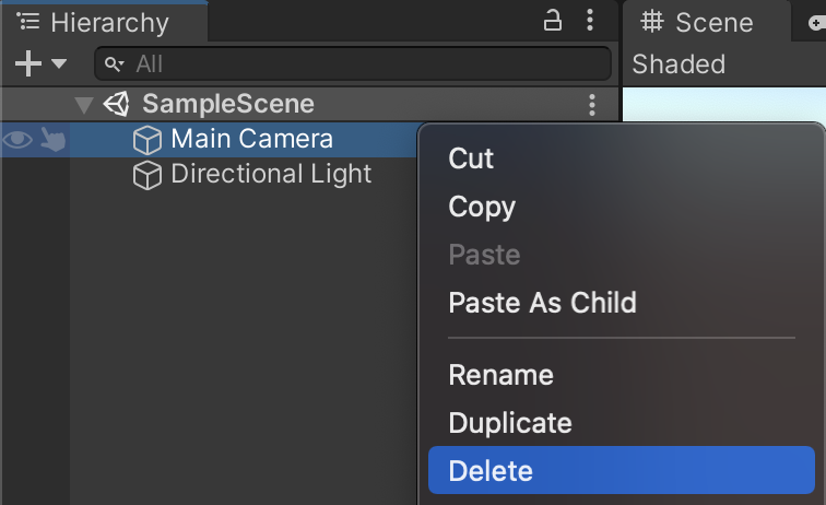 Sebelum menambahkan objek game baru, hapus Main Camera default. Parameter ini akan diganti dengan AR Camera baru di XR Origin.