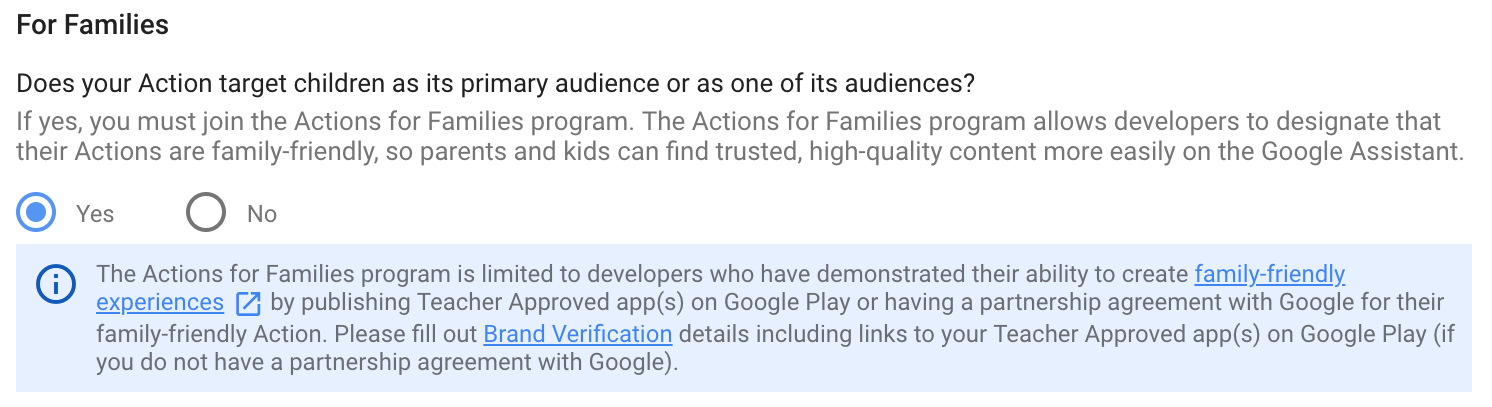 Before you submit your Actions project for the Actions for Families program, make sure your Actions project meets our Program Requirements and is compliant with the Children's Online Privacy Protection Act (COPPA), the EU General Data Protection Regulation (GDPR), and any other applicable laws or regulations. These policies are in place to ensure your Action is appropriate for the whole family.