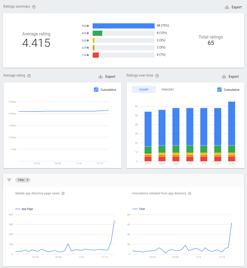 - Vues des pages du répertoire de l'Assistant: nombre de fois que la page de répertoire de votre action a été consultée par jour. Les vues peuvent être filtrées par pays/région, langue et autres options de catégorisation utiles.