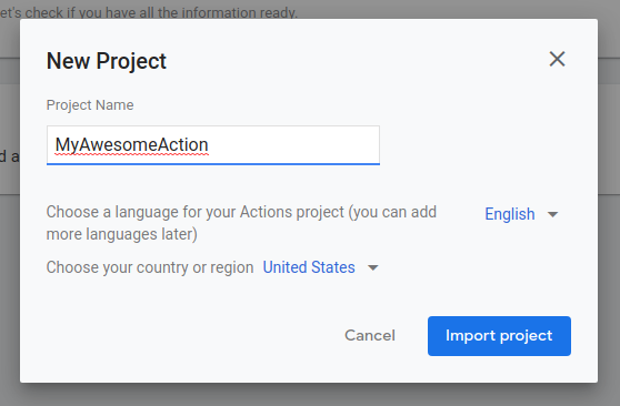 Se vuoi creare l'azione su un progetto Cloud esistente o su un progetto Firebase esistente, scegli il progetto nel menu a discesa all'interno della finestra di dialogo Nuovo progetto. Quando inizi a digitare, vengono visualizzati i nomi dei progetti esistenti. Fai clic sul progetto da importare.