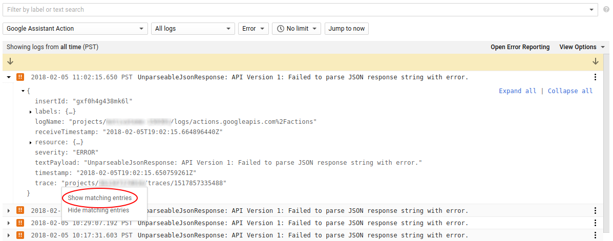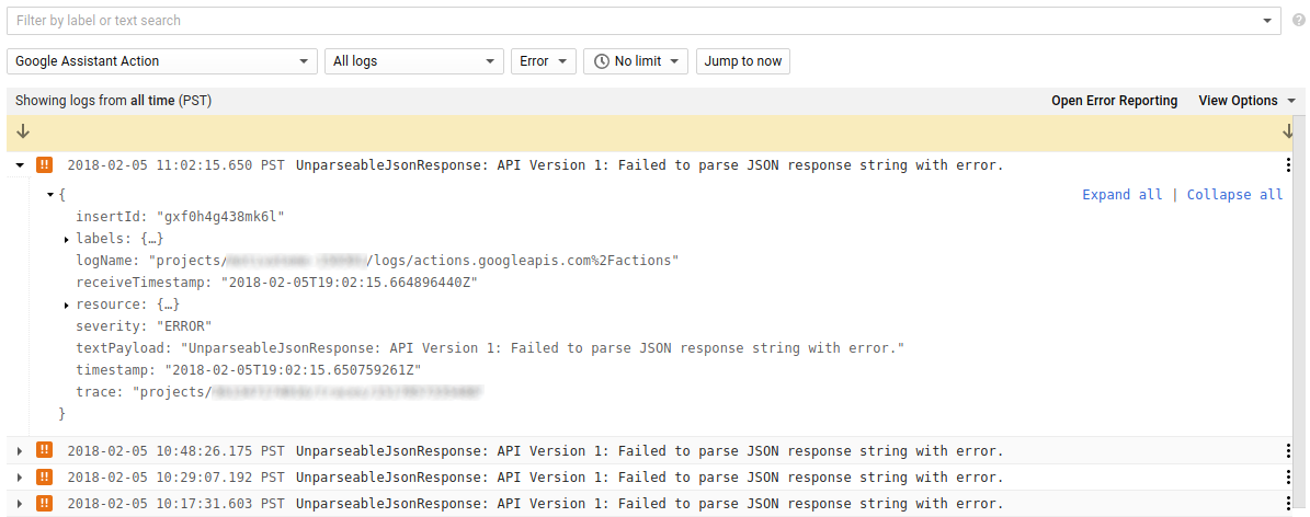 ในกรณีที่โปรเจ็กต์ Actions ล้มเหลวหรือดูเหมือนจะทํางานได้ไม่ดี สาเหตุของปัญหาอาจไม่ชัดเจน คุณสามารถดูบันทึกโดยละเอียดสำหรับโปรเจ็กต์ได้จากคอนโซล Actions ซึ่งจะให้ข้อมูลเชิงลึกเกี่ยวกับสิ่งที่เกิดขึ้นได้มากยิ่งขึ้น