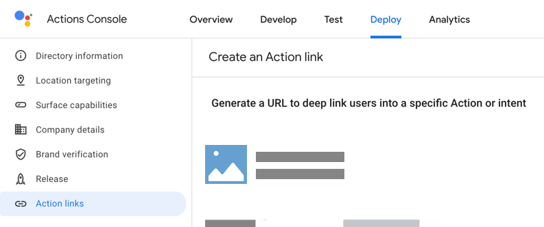 En la sección Implementar, encontrarás opciones disponibles para publicar tu acción. El menú de la izquierda para Implementar tiene las siguientes subsecciones: