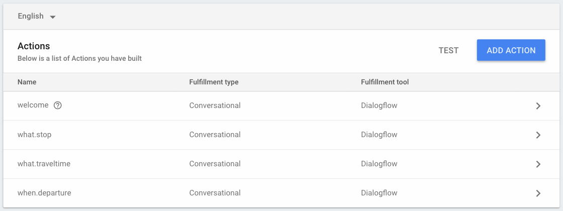 Puedes hacer clic en cualquiera de las acciones enumeradas para ver sus frases de invocación. Si usas Dialogflow, tienes la opción de Agregar más frases, que te vincula directamente a los intents de tu acción en Dialogflow.