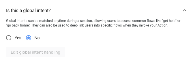 Los intents globales también se pueden usar para incluir vínculos directos de los usuarios en flujos específicos cuando invocan tu Acción. Es importante validar si los intents globales generados deben estar activos y ser accesibles para los usuarios en el alcance global. Para cambiar los intents globales a intents normales, haz clic en el intent y cambia la opción de control del intent global a NO.
