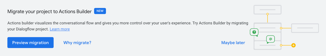 Como desarrollador de Dialogflow, te recomendamos que migres tus acciones existentes a Actions Builder. Usar el nuevo método en la consola para desarrollar acciones tiene una serie de beneficios, y es fácil migrar tu proyecto de Dialogflow existente. En esta página, se describe cómo usar la herramienta de migración Dialogflow/Actions Builder.