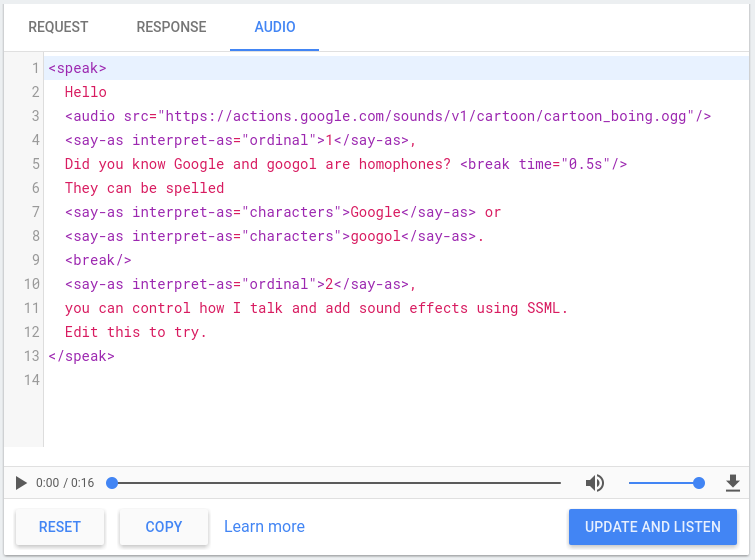 Konsol Actions menyertakan simulator TTS yang dapat Anda gunakan untuk menguji SSML dengan salah satu elemen di atas. Anda dapat menemukan simulator TTS di konsol di bagian Simulator > Audio. Ketik teks dan SSML di simulator dan klik Update dan Dengarkan untuk mendengarkan output TTS.