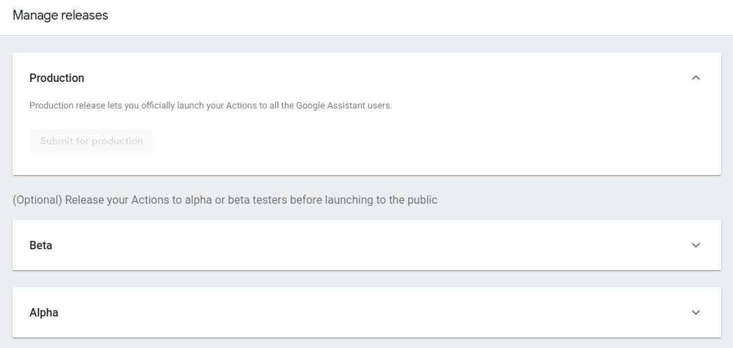 बीटा रिलीज़ चैनल से, कार्रवाई को ऐसे 200 उपयोगकर्ताओं के लिए रिलीज़ किया जा सकता है जिन्हें डेवलपर ने तय किया है. ये उपयोगकर्ता, कार्रवाई को Google Assistant की सुविधा वाले डिवाइसों से टेस्ट कर सकते हैं. अगर आपके प्रोजेक्ट की Google से समीक्षा हो चुकी है, तो बीटा रिलीज़ आपके संगठन से बाहर के उपयोगकर्ताओं को ऐक्सेस देने के लिए सही होती हैं. जब आप अपने बीटा परीक्षण के परिणाम से संतुष्ट हो जाएं, तो आप बीटा वर्शन को प्रोडक्शन में रिलीज़ कर सकते हैं, क्योंकि वह Google नीति समीक्षा में पहले ही सफल हो चुका है.