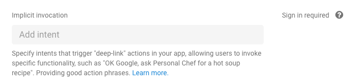图 4. Google 助理集成模态窗口中的“隐式调用”部分的屏幕截图。