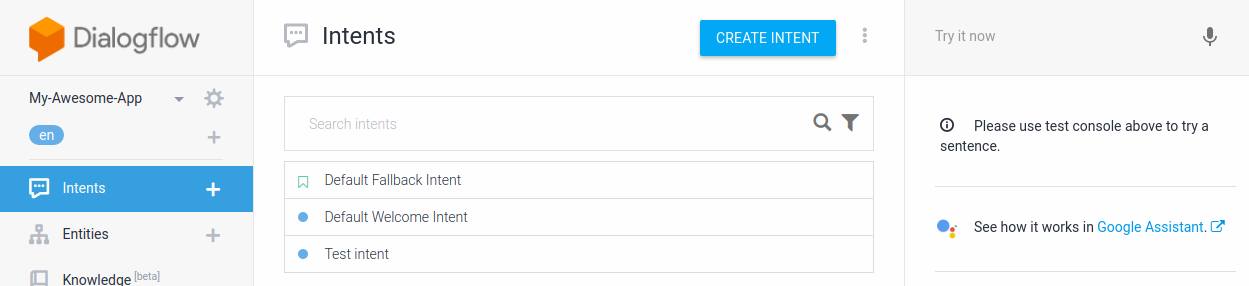Dialogflow 模擬工具位於頁面右側,您可以藉由語音或輸入訊息的方式試用代理程式。在 Dialogflow 模擬工具中,按一下「Try it now」(立即試用) 並輸入任何內容,然後按下 Enter 鍵。