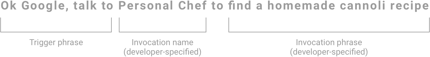 Nutzer kombinieren Ihren Aufrufnamen mit Aufrufsätzen, um explizit bestimmte Intents aufzurufen, z. B.: "Ok Google, sprich mit Personal Chef, um mir Rezepte zu finden."