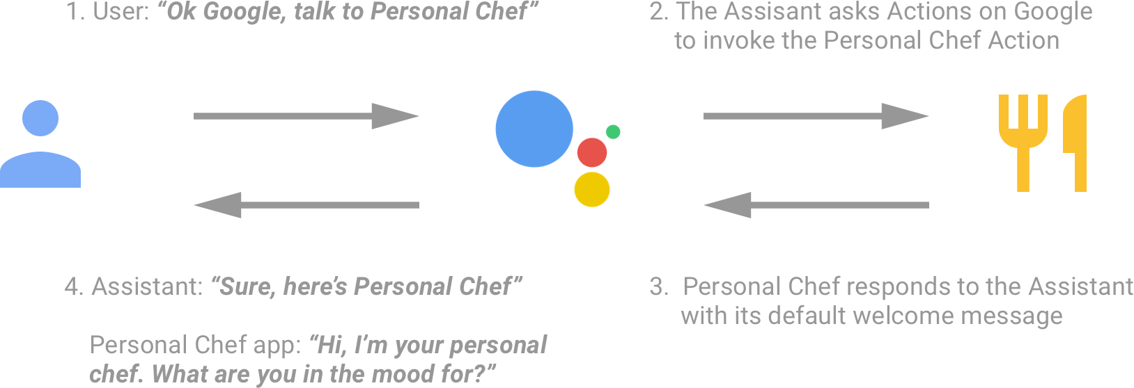 [[["わかりやすい","easyToUnderstand","thumb-up"],["問題の解決に役立った","solvedMyProblem","thumb-up"],["その他","otherUp","thumb-up"]],[["必要な情報がない","missingTheInformationINeed","thumb-down"],["複雑すぎる / 手順が多すぎる","tooComplicatedTooManySteps","thumb-down"],["最新ではない","outOfDate","thumb-down"],["翻訳に関する問題","translationIssue","thumb-down"],["サンプル / コードに問題がある","samplesCodeIssue","thumb-down"],["その他","otherDown","thumb-down"]],["最終更新日 2025-07-28 UTC。"],[],["Explicit invocation allows users to engage Actions by name using trigger phrases like \"Ok Google, talk to...\" followed by the Action's name (e.g., \"Personal Chef\"). Users can also add an optional invocation phrase to direct the Action to a specific task (e.g., \"find me recipes\"). If no phrase is included it triggers `actions.intent.MAIN`. The directory and specific invocation phrases enhance Action discoverability. Trigger phrases may be overwritten by apps.\n"]]