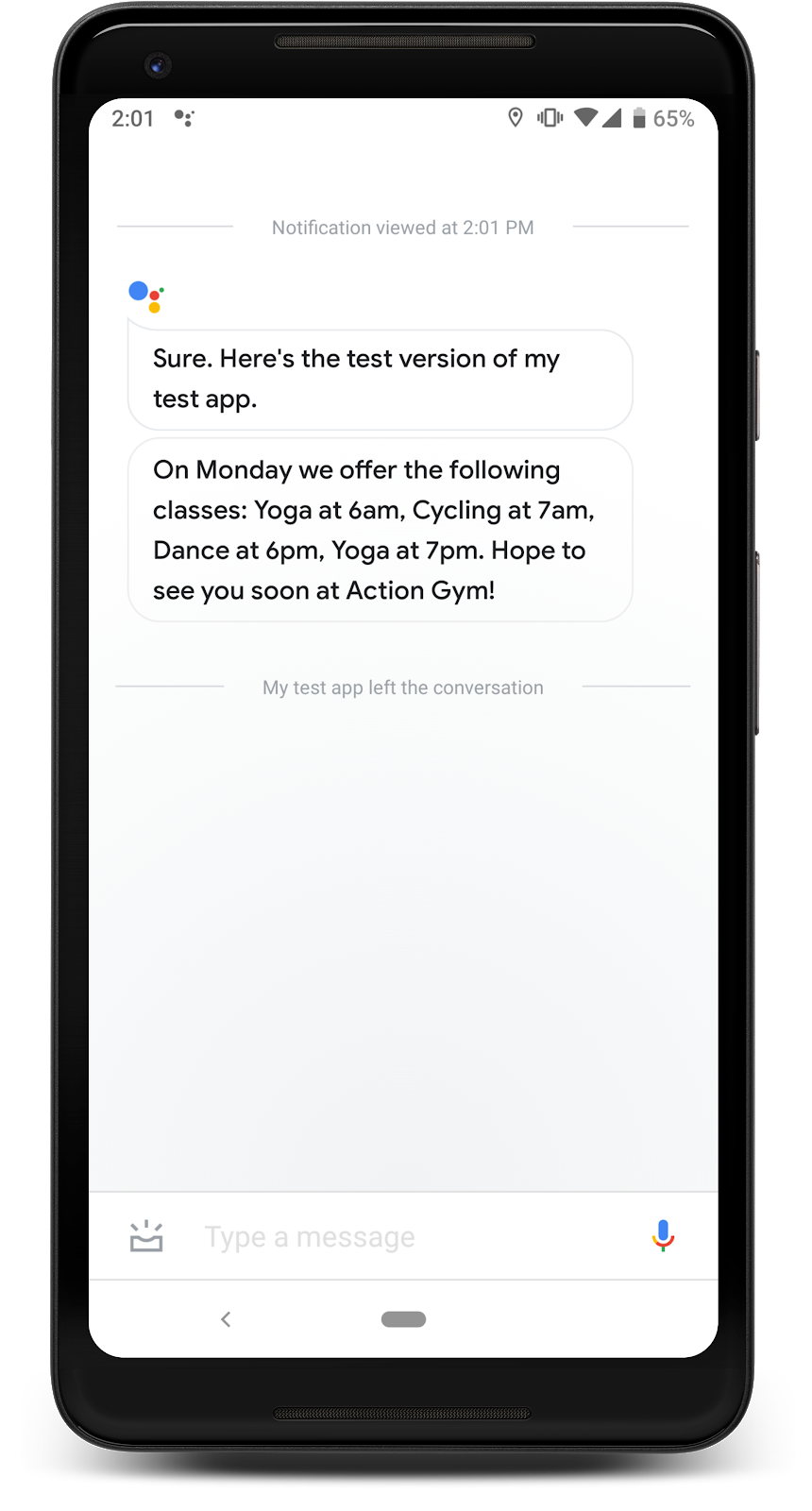 Menguji info terbaru harian menggunakan perangkat seluler dengan Asisten Google menggunakan akun Google yang sama yang Anda gunakan untuk membuat Action. Memanggil Action Anda dan berlangganan pembaruan harian, lalu periksa notifikasi perangkat Anda waktu pembaruan.