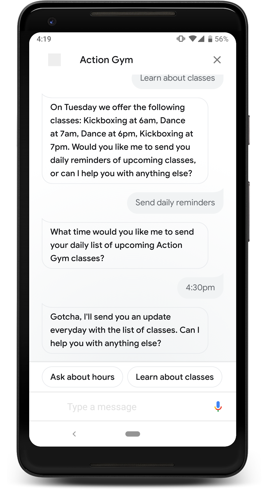 Jika Action Anda menawarkan informasi berguna yang berubah setiap hari atau membantu pengguna dengan tugas harian, aktifkan langganan update harian di Action Anda. Misalnya, kirim pengingat yang berguna kepada pengguna setiap hari dengan rencana olahraga mereka. -
