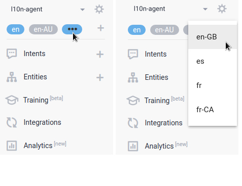 5. Erstellen Sie Intents wie gewohnt und klicken Sie auf die Sprachchips, um die Formulierungen von Nutzer sagt und Antworten von Dialogflow für jede Sprache oder Region anzupassen.