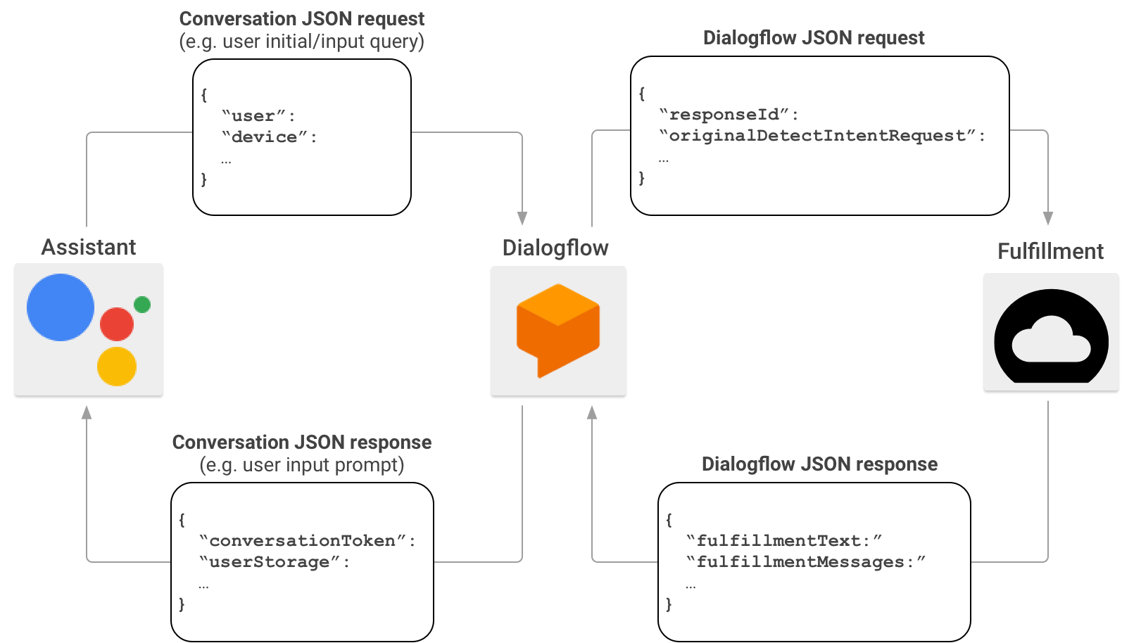 เมื่อ Actions on Google พบว่า Fulfillment ของคุณตรงกับคำขอของผู้ใช้แล้ว ก็จะเป็นการเริ่มเซสชันการสนทนาโดยส่งคำขอ HTTP ที่มีเพย์โหลด JSON ที่มีข้อมูลคำขอของผู้ใช้ไปยังปลายทาง Fulfillment ของคุณ Fulfillment ของคุณแยกวิเคราะห์คำขอและแสดงผลการตอบกลับที่มีเพย์โหลด JSON จากนั้น Actions on Google จะแปลงเพย์โหลดเป็นเอาต์พุตเสียงพูดและมัลติมีเดียที่แสดงผลให้ผู้ใช้