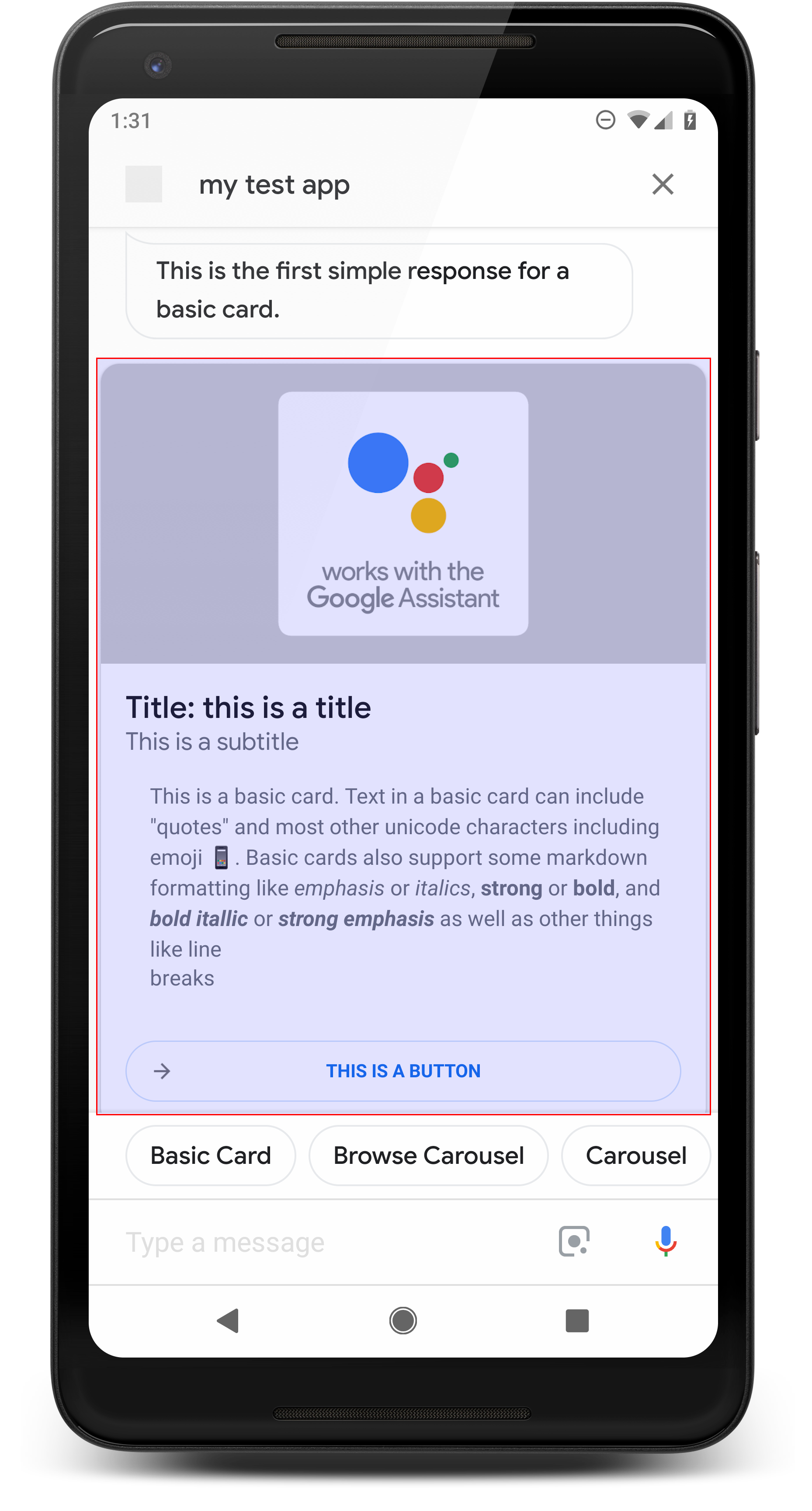 app.intent('Basic Card', (conv) => { if (!conv.screen) { conv.ask('Sorry, try this on a screen device or select the ' + 'phone surface in the simulator.'); conv.ask('Which response would you like to see next?'); return; } conv.ask(`Here's an example of a basic card.`); conv.ask(new BasicCard({ text: `This is a basic card. Text in a basic card can include "quotes" and most other unicode characters including emojis. Basic cards also support some markdown formatting like *emphasis* or _italics_, **strong** or __bold__, and ***bold itallic*** or ___strong emphasis___ as well as other things like line \nbreaks`, // Note the two spaces before '\n' required for // a line break to be rendered in the card. subtitle: 'This is a subtitle', title: 'Title: this is a title', buttons: new Button({ title: 'This is a button', url: 'https://assistant.google.com/', }), image: new Image({ url: 'https://storage.googleapis.com/actionsresources/logo_assistant_2x_64dp.png', alt: 'Image alternate text', }), display: 'CROPPED', })); conv.ask('Which response would you like to see next?'); });