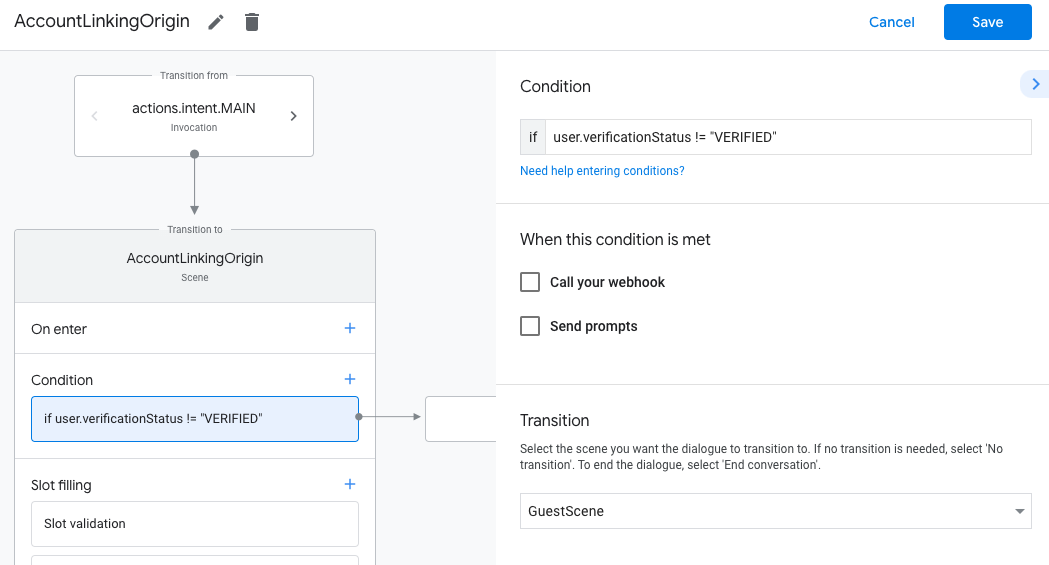 Enter new expressionในส่วนเงื่อนไข ให้ป้อนตรรกะต่อไปนี้user.verificationStatus != "VERIFIED" - ในส่วนการเปลี่ยนฉาก ให้เลือกฉากที่ไม่ต้องลิงก์บัญชีหรือฉากที่เป็นจุดเริ่มต้นของฟังก์ชันการทำงานสำหรับแขกรับเชิญเท่านั้น